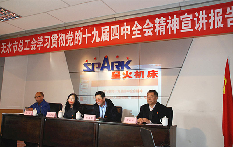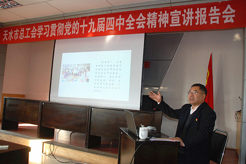 1月7日,天水市總工會學(xué)習(xí)貫徹黨的十九屆四中全會精神宣講報告會在星火機床公司舉行,天水市總工會邀請中共天水市委宣講團成員、甘肅林業(yè)職業(yè)技術(shù)學(xué)院教授謝小平為星火機床公司黨支部書記、分會主席和部分員工作了《以制度優(yōu)勢托起人民獲得感、幸福感、安全感》為主題的黨的十九屆四中全會精神學(xué)習(xí)專題宣講報告。天水市總工會黨組成員、副主席張虎琴,副主席衡俊強,星火機床公司黨委副書記、工會主席蔣俊及各黨支部書記、分會主席和部分員工80多人參加了報告會。衡俊強主持報告會。