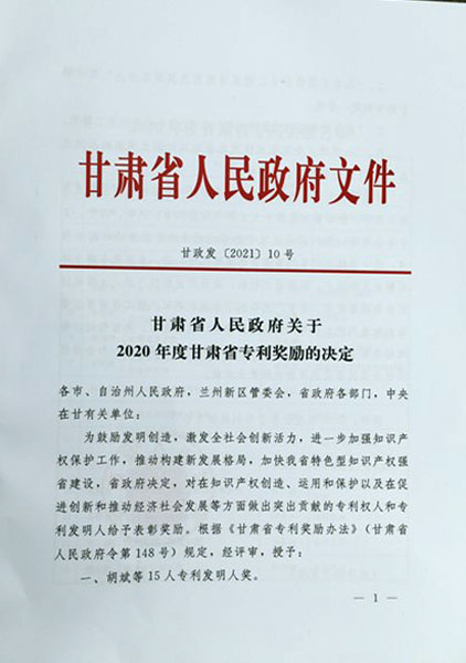 甘肅省政府向受到表彰獎(jiǎng)勵(lì)的專利發(fā)明人頒發(fā)了獲獎(jiǎng)證書。