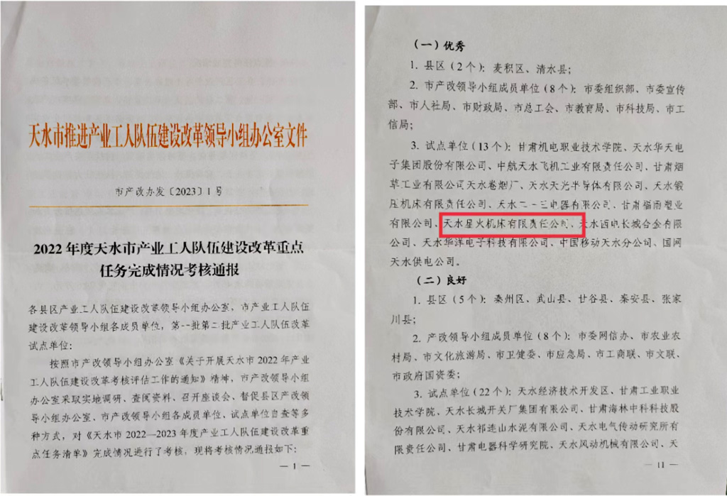 日前,天水市產(chǎn)業(yè)工人隊(duì)伍建設(shè)改革領(lǐng)導(dǎo)小組辦公室采取了實(shí)地調(diào)研、查閱資料、召開座談會(huì)、試點(diǎn)單位自查等多種方式,對(duì)《天水市2022—2023年度產(chǎn)業(yè)工人隊(duì)伍建設(shè)改革重點(diǎn)任務(wù)清單》完成情況進(jìn)行了考核,通報(bào)結(jié)果顯示,天水星火機(jī)床有限責(zé)任公司被評(píng)為優(yōu)秀試點(diǎn)單位。