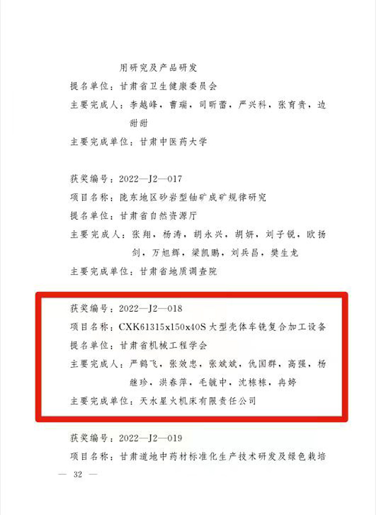 日前,甘肅省人民政府對在我省科學(xué)技術(shù)進(jìn)步、經(jīng)濟(jì)社會發(fā)展中作出突出貢獻(xiàn)的科學(xué)技術(shù)人員和組織進(jìn)行了評審獎(jiǎng)勵(lì)。由星火機(jī)床集團(tuán)公司機(jī)床研究院科研人員嚴(yán)鶴飛、張效忠、張斌斌、仇國群、高強(qiáng)、楊繼珍、洪春萍、毛毓中、沈棟棟、冉婷研發(fā)的CXK61315x150x40S大型殼體車銑復(fù)合加工設(shè)備榮獲甘肅省科學(xué)技術(shù)進(jìn)步獎(jiǎng)二等獎(jiǎng)。