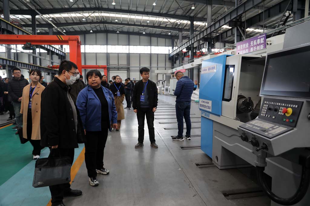 楊金明一行先后參觀了公司數(shù)控裝配現(xiàn)場、公司展廳和青海重型裝配現(xiàn)場,通過實地參觀、聽取介紹、座談交流,詳細了解企業(yè)生產(chǎn)運營、人才引進、人才培育、招聘招工等情況。