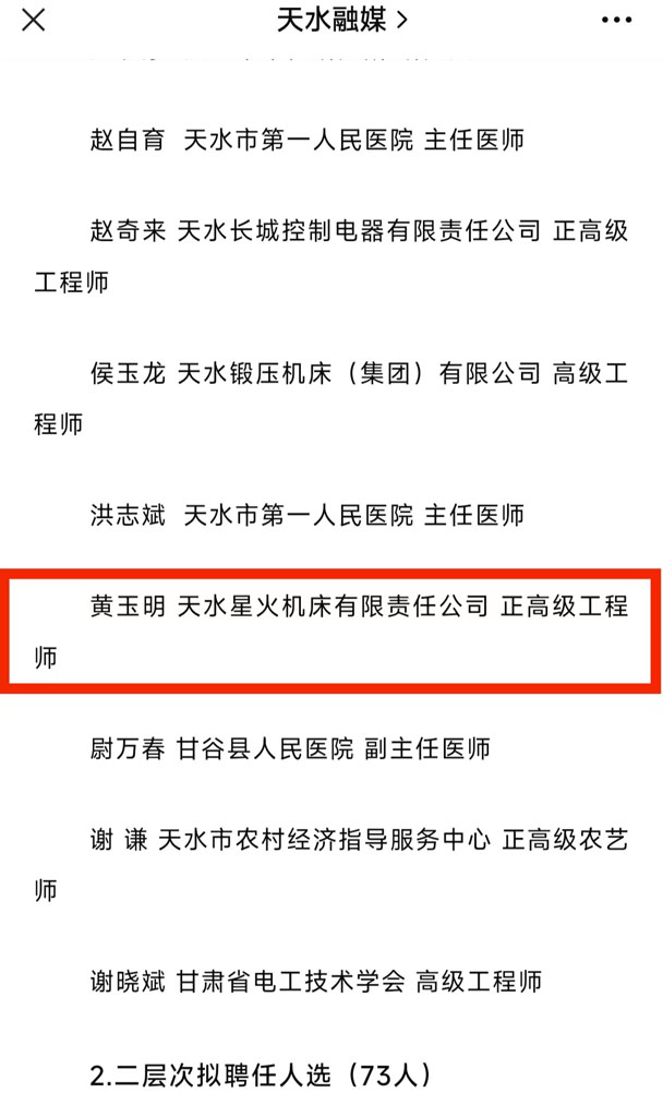 日前,天水市領(lǐng)軍人才第三批入選名單公布,星火機(jī)床集團(tuán)公司機(jī)床研究院數(shù)控系列產(chǎn)品總設(shè)計(jì)師、正高級工程師黃玉明入選第三批第一層次。