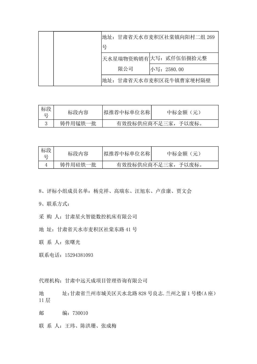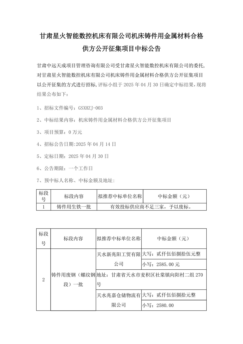 甘肅星火智能數(shù)控機(jī)床有限公司機(jī)床鑄件用金屬材料合格供方公開征集項(xiàng)目中標(biāo)公告