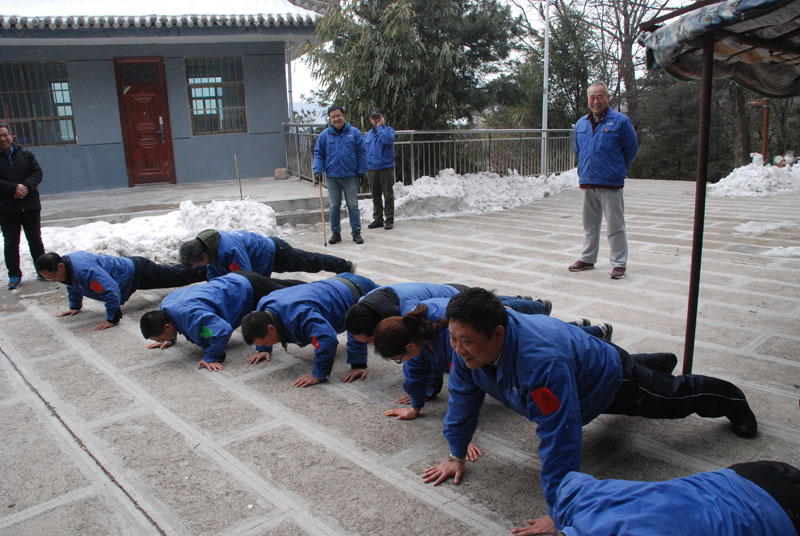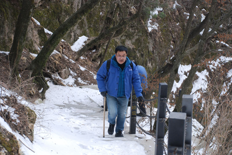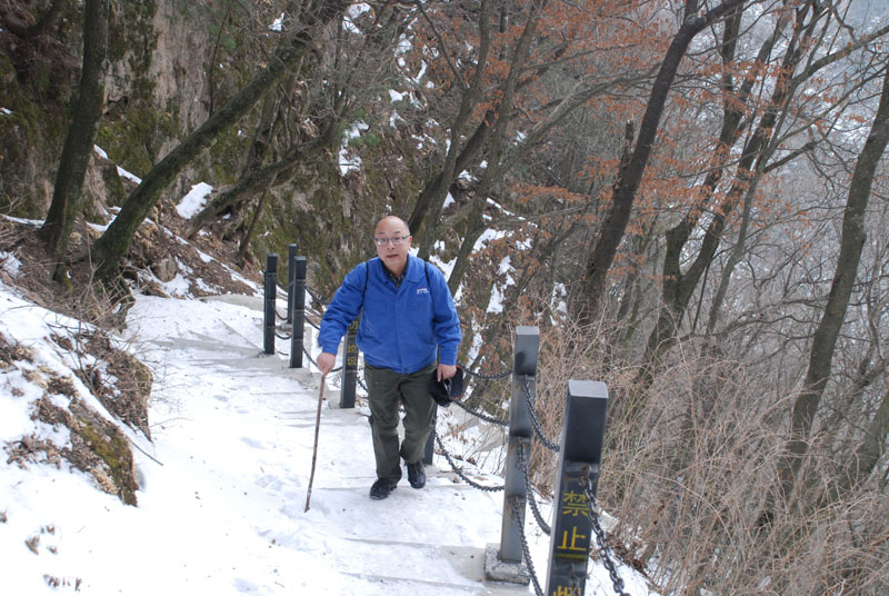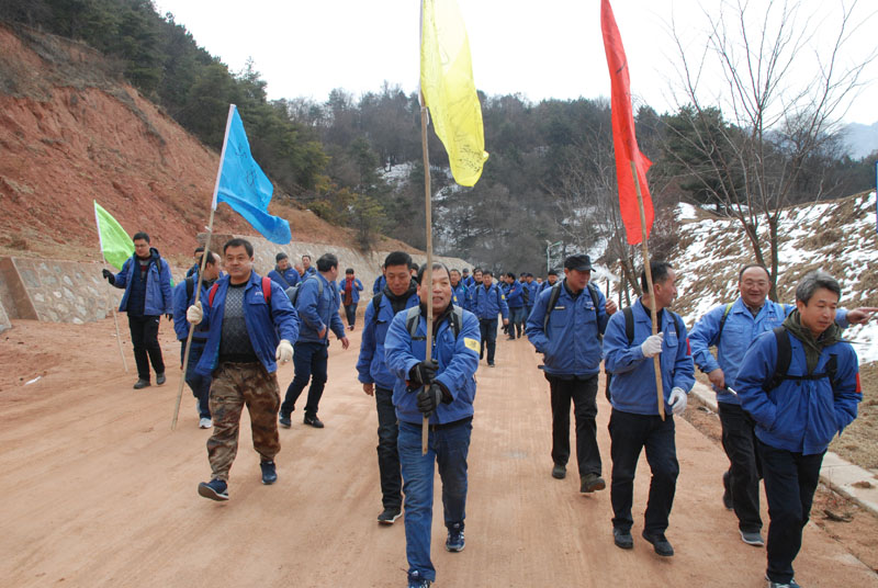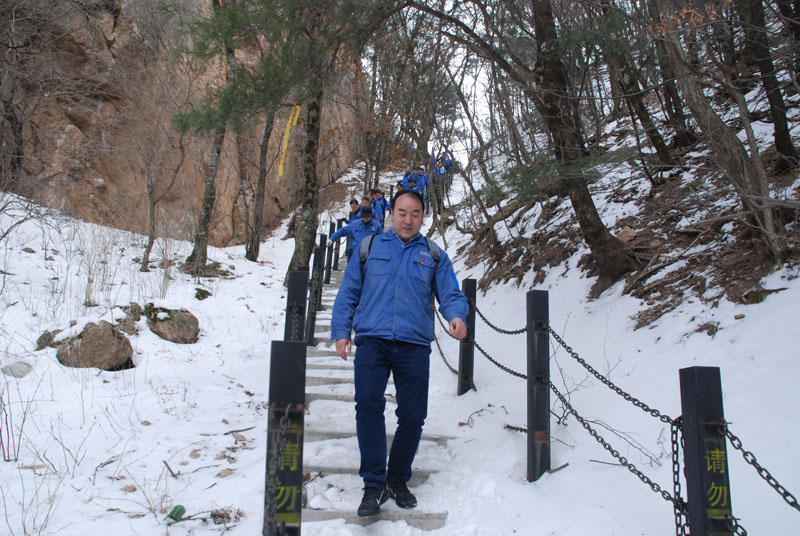 一切安排就緒,隊員們朝著山頂出發(fā)。山里的天氣較之外面更為寒冷,爬山的過程中還不時有雪花飄落,上山的臺階上堆積了一層薄冰,增加了爬山的難度。盡管如此,大家爭先恐后,竭盡全力,直奔目標(biāo)。熱情的回聲打破了山谷的寂靜,冰冷的空氣仿佛也有了熱度。10公里的上坡及上山,對平時鍛煉不足的人來說確實(shí)是極大的考驗(yàn),爬山過程中,大家相互鼓勵、互相扶持,幾位年紀(jì)偏大或身體不適的隊員克服了困難,堅持爬到山頂,決不放棄。
