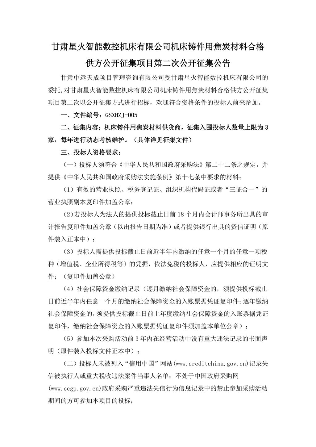 甘肅星火智能數(shù)控機(jī)床有限公司機(jī)床鑄件用焦炭材料合格供方公開征集項(xiàng)目第二次公開征集公告